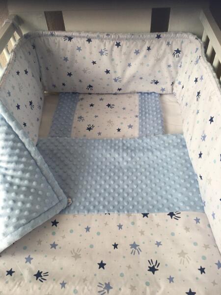 Három részes (takaró + párna + fejvédő)  színes vidám mintákkal készült babaágynemű szett, az anyukák és a kisbabák legnagyobb örömére. A fejvédő óvja a már fejét emelgetni tudó babát az ággyal való ütközéstől, mely megkötők segítségével erősíthető a kiságyhoz.