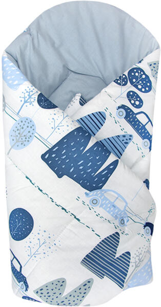 Gyönyörű babapólya autós motívummal. A pólya fehér és kék színének kombinációja gyönyörűen passzol egymáshoz. A pólyát az autók mellett fák és hegyek motívumai is díszítik. Tulajdonságok : nagyon kellemes tapintású tépőzáras rögzítés tanúsított anyagokból nagyon precíz és minőségi kialakítás Anyaga : 100% pamut antiallergén szilikon tömés Méretek : 80x80 cm