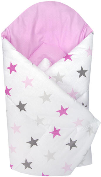 Gyönyörű babapólya csillag motívummal. A pólya fehér, szürke és rózsaszín színeinek kombinációja gyönyörűen passzol egymáshoz. Tulajdonságok : nagyon kellemes tapintású tépőzáras rögzítés tanúsított anyagokból nagyon precíz és minőségi kialakítás Anyaga : 100% pamut antiallergén szilikon tömés Méretek : 80x80 cm