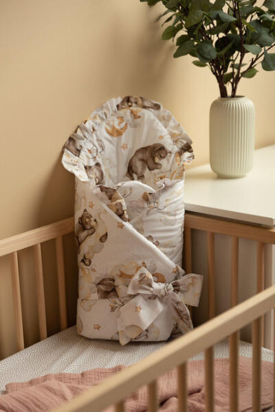 A kétoldalas fodros babapólya újszülöttek és csecsemők számára készült. A széles szalaggal megkötött rögzítési mód lehetővé teszi a baba kényelmes tartását etetés és elalvás közben. Kibontás után a pólya sikeresen használható kiságy vagy babakocsi paplanként is. Játszószőnyegnek is tökéletes. Összetétel: