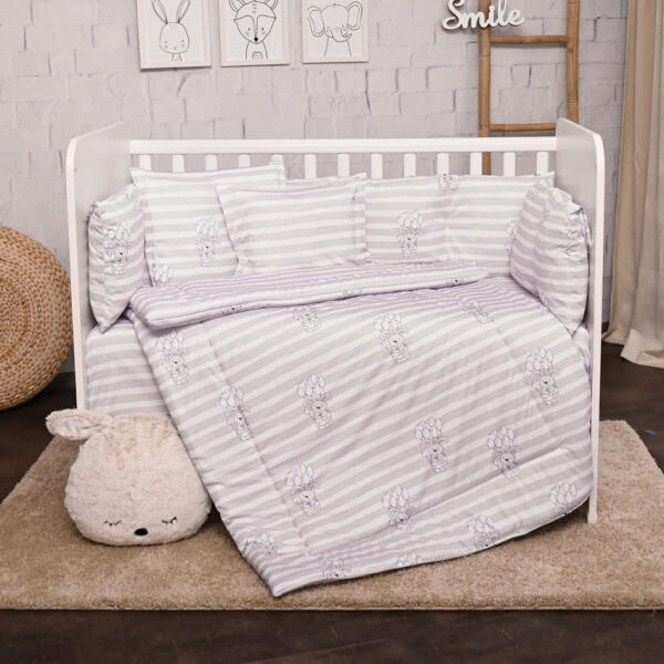 Lorelli 5 részes mintás ágyneműgarnitúra Huzatuk 100% pamut, bélésük könnyen kezelhető, és mosáskor nem csomósodik össze. 30°-on mosható, vasalható. Az 5 részes ágynemű garnitúra 360 fokos rácsvédővel vásárolható meg, a baba számára tökéletes alvóhely alakítható ki. Az 5 részes garnitúra részei: