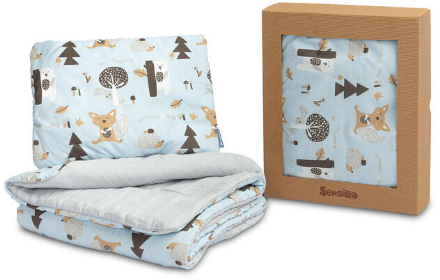 A kiságyszett egyik oldalán kiváló minőségű muszlin, másik oldalán nyomott pamut kombinációja. Egy kétoldalas lapos párnából és egy töltelékes paplanból áll. A természetes és légies szövetek kombinációja tökéletes lesz kiságynak vagy bölcsőnek. Antiallergén szilikon gyapjúval van töltve. A készlet ízléses kartondobozba van csomagolva, ajándéknak is tökéletes.
