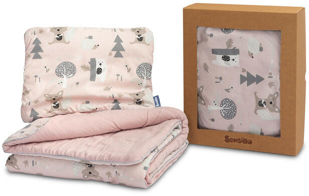 A kiságyszett egyik oldalán kiváló minőségű muszlin, másik oldalán nyomott pamut kombinációja. Egy kétoldalas lapos párnából és egy töltelékes paplanból áll. A természetes és légies szövetek kombinációja tökéletes lesz kiságynak vagy bölcsőnek. Antiallergén szilikon gyapjúval van töltve. A készlet ízléses kartondobozba van csomagolva, ajándéknak is tökéletes.