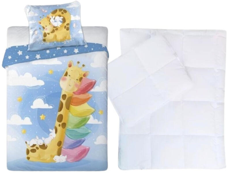 : szett tartalma 1 db ágyneműhuzat 100x135 cm-es méretben 1 db párnahuzat 40x60 cm-es méretben 1 db paplan 100x135 cm-es méretben ( 300g ) 1 db párna 40x60 cm-es méretben ( 80g ) a paplan-párna anyaga 100% aloe vera kikészítésű microfiber poliészter : gyerekágynemű anyaga 100% pamut : mi, mit jelent? kattintside Nagyon aranyos motívumokkal ellátott 2 részes zsiráfos gyermek ágyneműhuzat garnitúra , a hozzá méretben azonos Lalian paplan-párna szett el együtt.